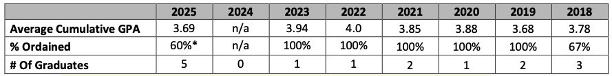 Comprehensive Exam Scores: Graduates must past a comprehensive exam process that serves as a core assessment tool designed to measure achievement and proficiency. Average scores are listed below using a 4-point grading scale. Students must earn > 2.5 for an MDiv and > 3.0 for an STB. * Only includes 2020 graduates who took the STB comprehensive exams in February 2021 (4 of 7). MDiv comprehensive exam was waived due to the pandemic. **STB degree no longer offered as of 2024.